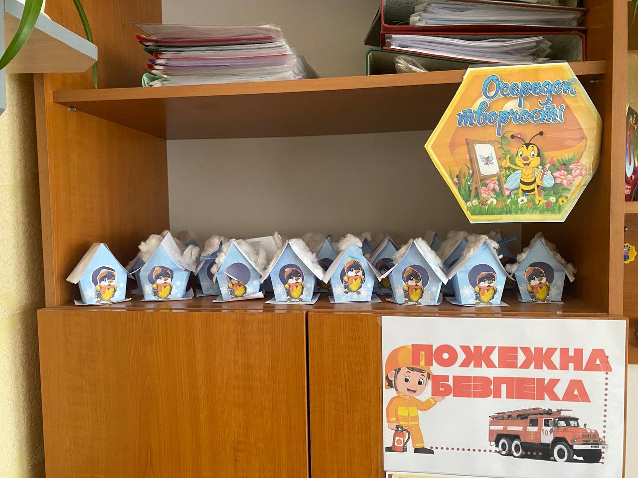 Осередок творчості – це зона в якій діти зможуть реалізувати свій творчий потенціал. Сама шафа наповнена альбомами для малювання, фарбами, фломастерами, пластиліном, кольоровими олівцями. Для виставки робіт є зона з нитками, де можна прищеплювати усі дитячі роботи та зона на шафі, де можна виставити різні роботи.