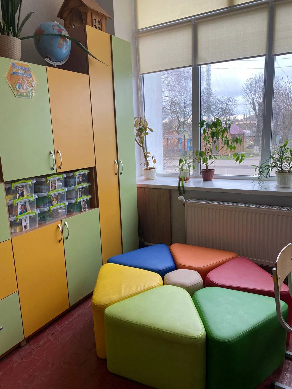 Осередок відпочинку - – це зона, створена для релаксації та відновлення сил учнів. Тут можна знайти м'які пуфи, невеликі килимки для сидіння, книжки для відпочинку або цікаві головоломки. У цій зоні діти можуть спокійно відпочити, послухати музику або просто провести час у тиші, що дозволяє їм відновити концентрацію та енергію для подальших занять. Також тут можна попрактикувати медитацію або дихальні вправи для зниження стресу та підвищення емоційного комфорту.
